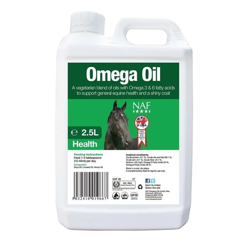 NAF Omega Oil on kvaliteetne energiaallikas, mis sisaldab olulisi oomega-rasvhappeid (Oomega 3, 6 ja 9), et toetada hobuse energia ainevahetust, immuunsüsteemi ning naha ja karvkatte tervist.