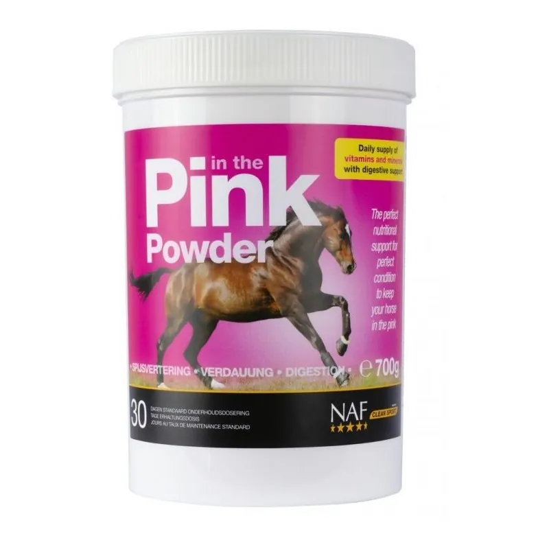 NAF In The Pink Powder on spetsiaalselt välja töötatud hobuse üldise tervise, vormi ja seedimise toetamiseks – sobilik nii pere lemmikutele kui ka tippvõistlushobustele. See täisväärtuslik segu sisaldab hoolikalt valitud vitamiine, mineraale ja mikrotoitaineid, mis aitavad hoida hobuse hea välimuse ja sisemise tasakaalu, pakkudes samas seedetrakti tuge paremaks toitainete omastamiseks.