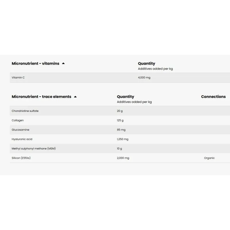 Sisaldab kollageeni, glükoosamiini, kondroitiini, hüaluroonhapet, MSM-i ja räni