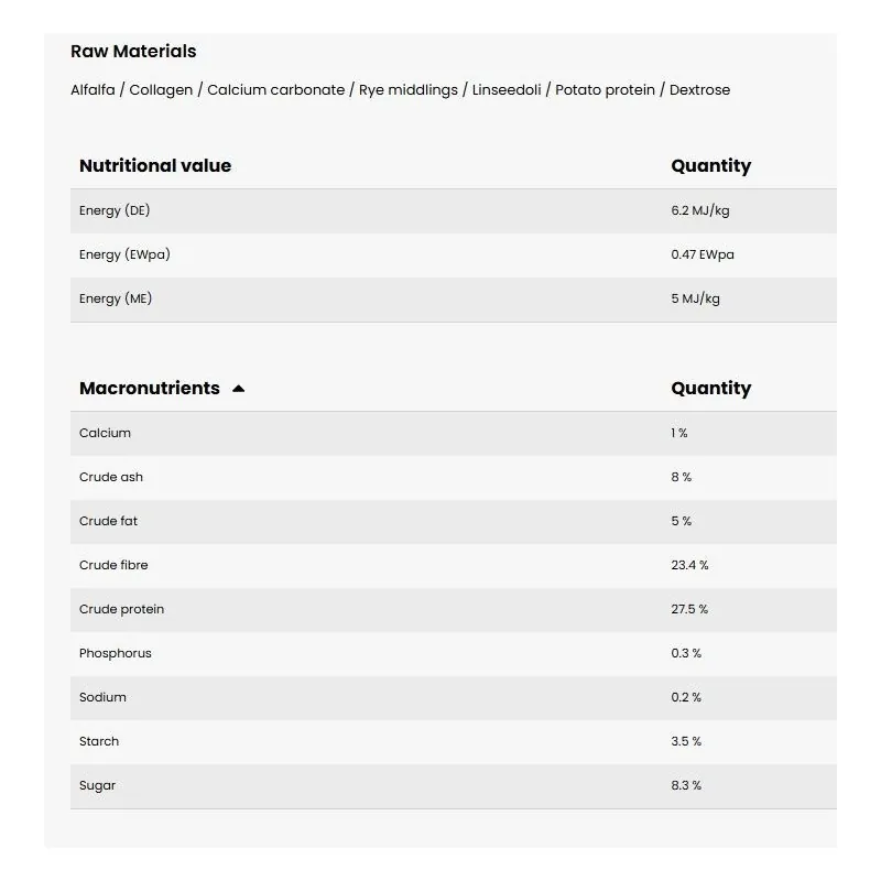| Ravikuurina / eakatele hobustele | 100 g päevas | 50 g päevas |