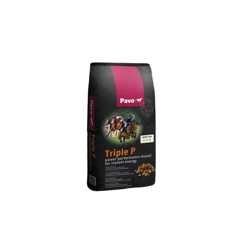 Pavo Triple P on maitsev müsli, mis annab hobusele kiiret ja plahvatuslikku energiat. See on spetsiaalselt loodud võistlusratsudele, show-hüppajatele ja tõlketele, kes vajavad lühiajalisi energiapuhanguid.