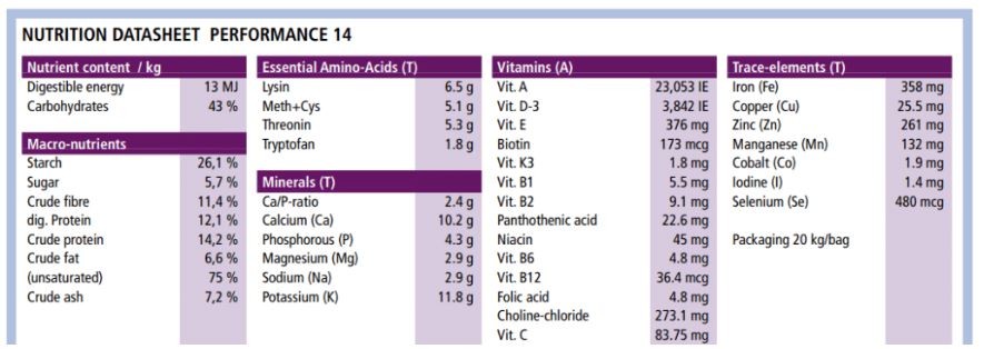 Performance 14 on eriline müsli, mis on loodud kõikidele hobustele ja ponidele, kes vajavad maksimaalset jõudlust. See kooslus toetab nii kiiruslikku kui ka vastupidavuslikku sooritust ning tagab lihaste optimaalse töövõime.