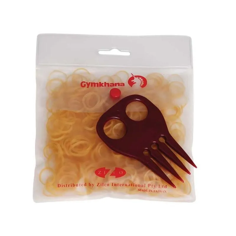 500 lakakummi mugavas trukksulguriga kotis, mille sees on ka patsikamm. Ideaalsed hobuse laka ja saba punumiseks – tugevad, elastsed ja kergesti kasutatavad.
