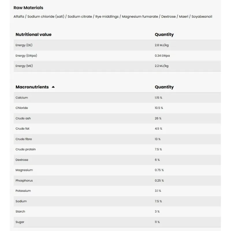 Horse (approx. 600 kg): 100 g per day