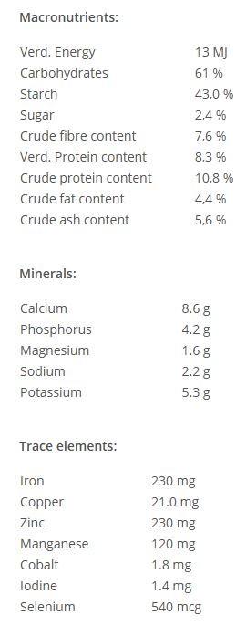 Oats, barley, maize(), wheat, wheat bran, sunflower meal, dried beet molasses pulp, calcium carbonate, soybean husks(), molasses, digested maize, vegetable oils and fats (linseed), sodium chloride, dextrose, monocalcium phosphate, vegetable oils and fats (soy()), maize gluten(), magnesium oxide