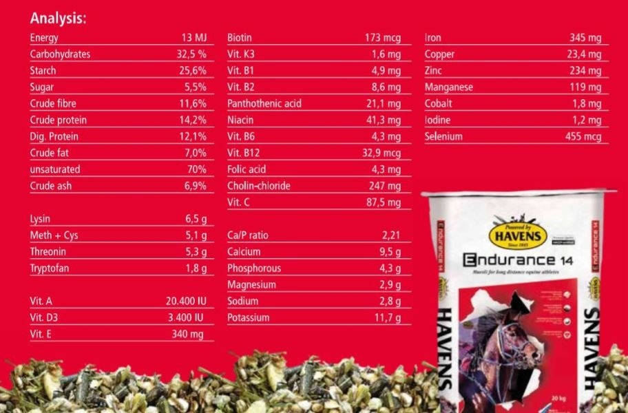 HAVENS Endurance 14 is specifically formulated to support horses facing long-lasting physical challenges. This concentrated energy muesli provides a unique combination of starch, oils, and fibers to fuel endurance athletes during both training and competition.