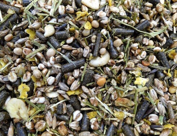 Ingredients: Wheat, dehydrated alfalfa meal, heat processed soybeans, puffed corn, wheat bran, oats, sunflower seed meal, barley flakes, puffed wheat, soybean hulls, cane molasses, corn, linseed oil, soybean oil, calcium carbonate, banana flakes, garlic flakes, salt, palm oil fatty acids, magnesium oxide, vitamins and minerals.